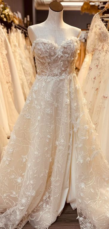 This style hugs close to the body, throughout the hips and thighs and then presents a very dramatic flare at the knee. This is the gown for the bride who loves a fit and flair, but wants more oomph!
